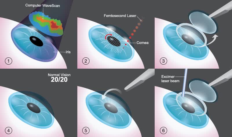 في عملية الليزك الخالية من الشفرات – وتسمى أيضًا الليزك الخالي من الشفرات أو الليزك بالكامل أو الفيمتو ليزك – يستخدم جراح الليزك نوعين من الليزر لإجراء تصحيح الرؤية. بعد ذلك ، يتم استخدام ليزر الإكسيمر لإعادة تشكيل نسيج القرنية الأساسي لتصحيح رؤيتك. ثم يتم إرجاع الغطاء إلى موضعه الأصلي.